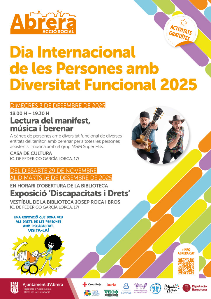 Així doncs, el proper dimecres 3 de desembre de 2025 a la Casa de Cultura (c. de Federico García Lorca, 17) de 18 h a 19.30 h, es farà la Lectura del manifest, a càrrec de persones amb diversitat funcional de diverses entitats del territori, seguida de berenar per a totes les persones assistents i música amb el grup M&M Super Hits. No us ho podeu perdre!