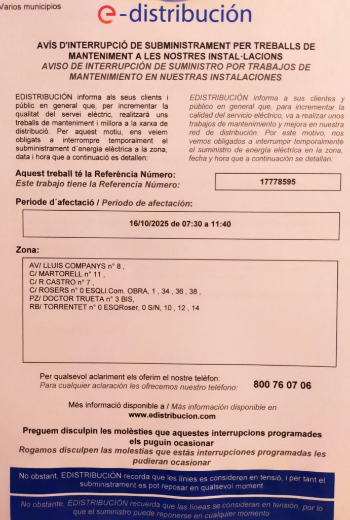 D'una banda, aquest dimecres 15 d’octubre de 2025, entre les 08.00 h i les 11.00 h, hi haurà un tall temporal del subministrament d’energia elèctrica al barri de Can Villalba. Podeu consultar el detall dels carrers que es veuran afectats per aquest tall de subministrament a la pàgina web d’EDISTRIBUCIÓN.
