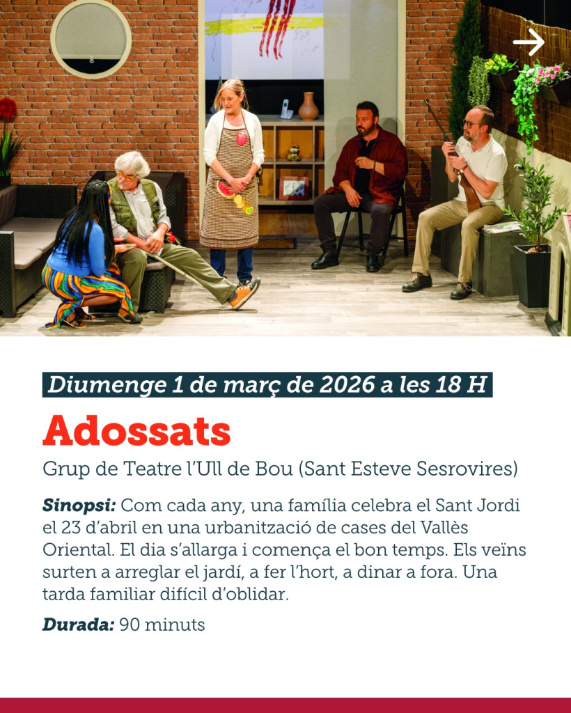Diumenge 1 de març de 2026, a les 18 h a la Sala Municipal (c. de Casamada, 12), el Grup de Teatre l’Ull de Bou (Sant Esteve Sesrovires), representarà l'obra 'Adossats', de Ramon Madaula.