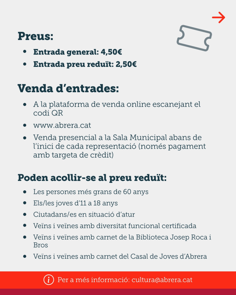 - Podeu adquirir la vostra entrada fent clic aquí o presencialment abans de l'inici de la representació (només pagament amb targeta de crèdit).