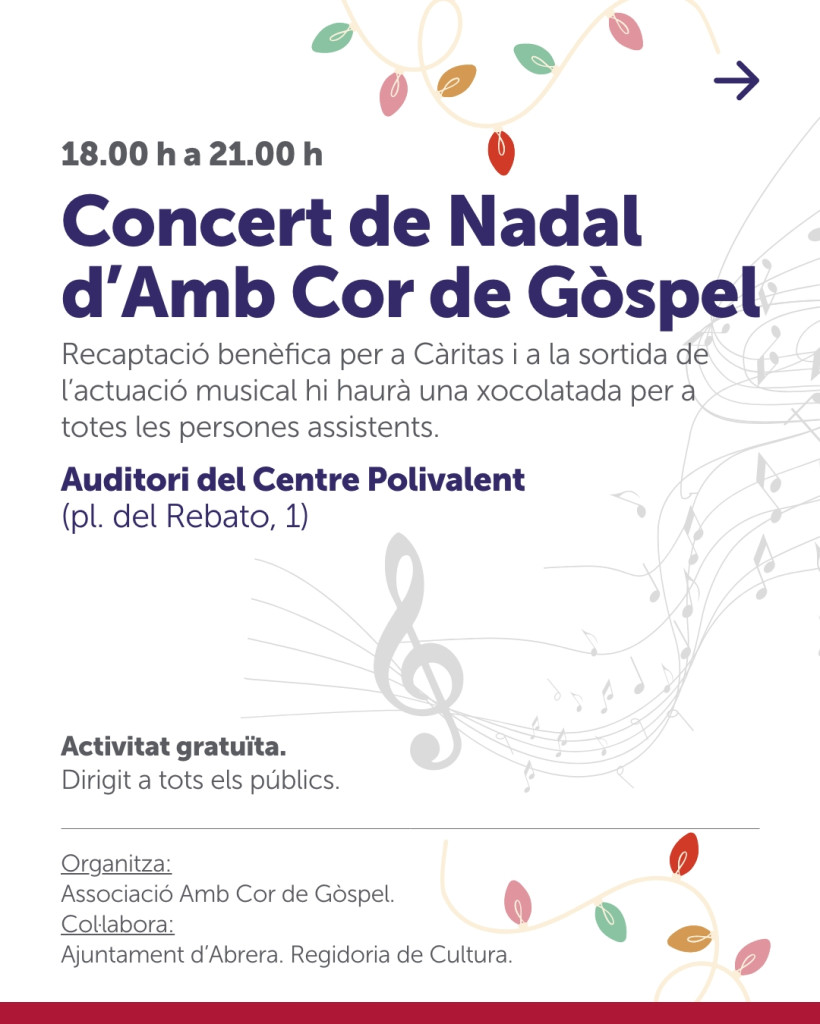 L'entitat Amb Cor de Gospel ha programat pel diumenge 14 de desembre el seu concert de Nadal, que tindrà lloc a l'Auditori del Centre Polivalent del Rebato, a partir de les 19 h. Es farà una recaptació solidària que es destinarà a Càritas Abrera i a la sortida de l'actuació musical es farà una xocolatada per a totes les persones assistents. No hi falteu!