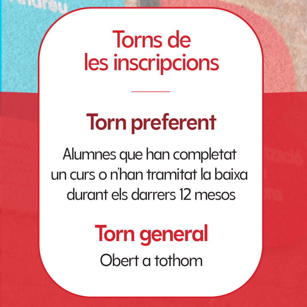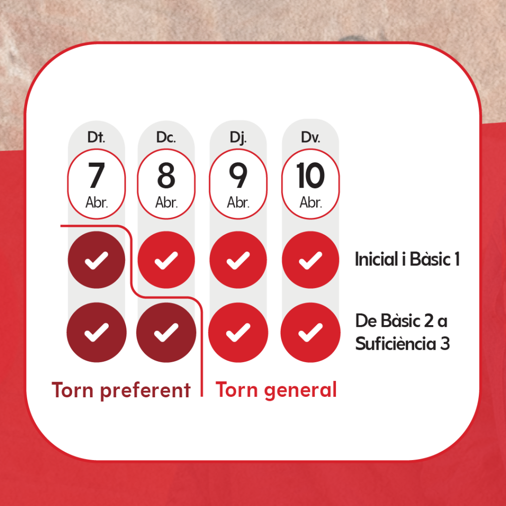 Les dates per a fer la inscripció seran el dimarts 7 d'abril (antics alumnes), dimecres 8 d'abril (cursos Inicial i Bàsic 1) i dijous 9 i divendres 10 d'abril (resta de cursos excepte C2) de 2026.