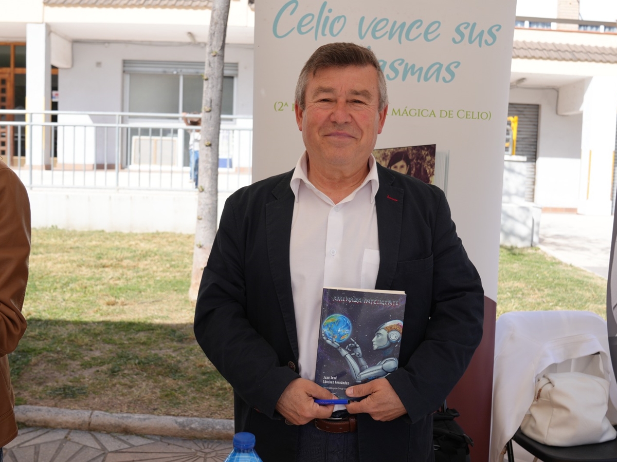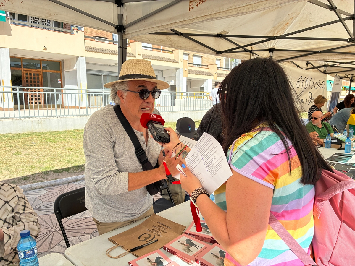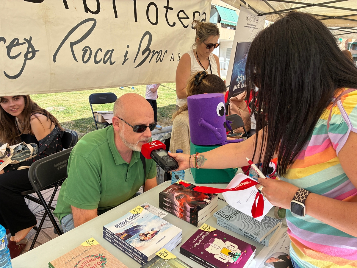 • J.D. Romero Mora: "Mi nombre es José Domingo Romero Mora, pero publico con el nombre J.D. Romero Mora. Hasta ahora he publicado siete libros, seis de ellos son novelas y uno un ensayo sobre música cinematográfica, y aquí los tengo todos para que mis conciudadanos de Abrera, si les gusta, pues elijan. Los libros son George Dunin, el compositor de los estudios Columbia, Navidad de cuento, El axioma de Sula, En el desvarío, Cambio de paradigma, Cuando se tienen dos casas y La falacia de la mujer de paja. La mayoría son novelas policíacas, mezcladas también con ciertas dosis de comedia y también de temas políticos, y Cambio de paradigma también es policíaca, pero de ciencia ficción. En El desvarío también se puede entender más que como una novela, quizá como una amalgama de relatos cortos que tienen conexión entre sí. Bueno, llevo un año viviendo aquí en Abrera, y el año pasado no tuve oportunidad de venir, pero este año pensé: no me lo pierdo, porque la verdad es que es un ambiente muy agradable, y estar entre vecinos siempre está bien, y darse un poco a conocer aquí en el pueblo".