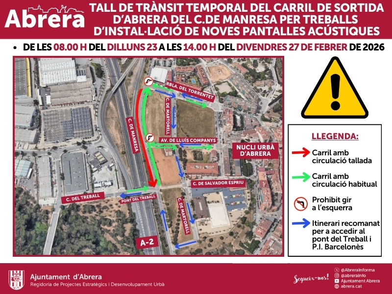 Els treballs que està executant el Ministeri de Transport per a la instal·lació de pantalles acústiques al carrer de Manresa, per reduir l'impacte acústic i visual de l'autovia A-2, continuen a bon ritme. De les 8 h d'aquest dilluns 23 i fins al divendres 27 de febrer de 2026, a les 14 h, es tallarà temporalment el carril de sortida del nucli urbà al carrer de Manresa, des de l’alçada del Mercat Municipal fins al pont del Treball.