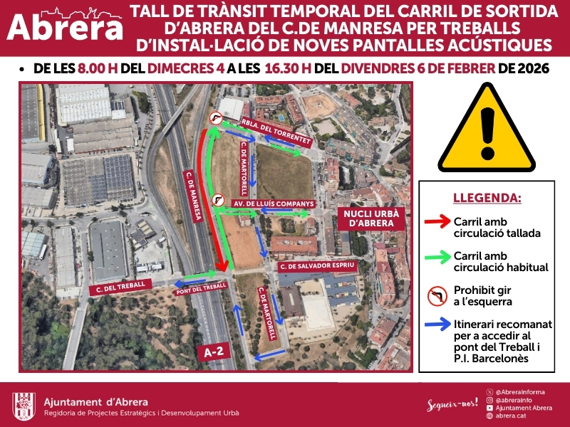 Els treballs que està executant el Ministeri de Transport per a la instal·lació de pantalles acústiques al carrer de Manresa, per reduir l'impacte acústic i visual de l'autovia A-2, continuen a bon ritme. De les 8 h del proper dimecres 4 a les 16.30 h del divendres 6 de febrer de 2026, es tallarà temporalment el carril de sortida del nucli urbà al carrer de Manresa, des de l’alçada del Mercat Municipal fins al pont del Treball, que mantindrà un únic carril de circulació en direcció al Mercat Municipal d'Abrera.
