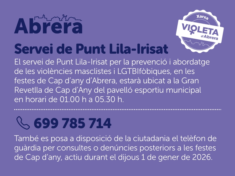 El servei de Punt Lila-Irisat per la prevenció i abordatge de les violències masclistes i LGTBIfòbiques, en les festes de Cap d’any d’Abrera, estarà ubicat a la Gran Revetlla de Cap d’Any del pavelló esportiu municipal, en horari de 01.00 h a 05.30 h.