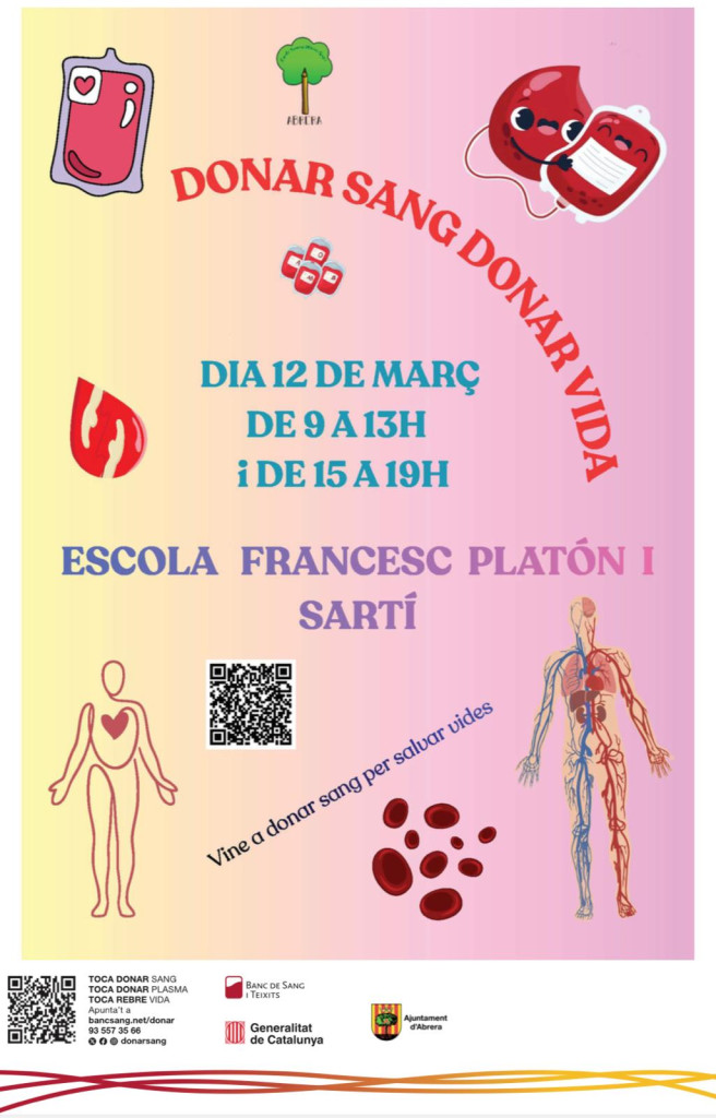 Donar sang, donar vida! L'Escola Francesc Platón i Sartí d'Abrera organitza una nova campanya de donació de sang el proper dijous 12 de març. Veniu a donar sang!