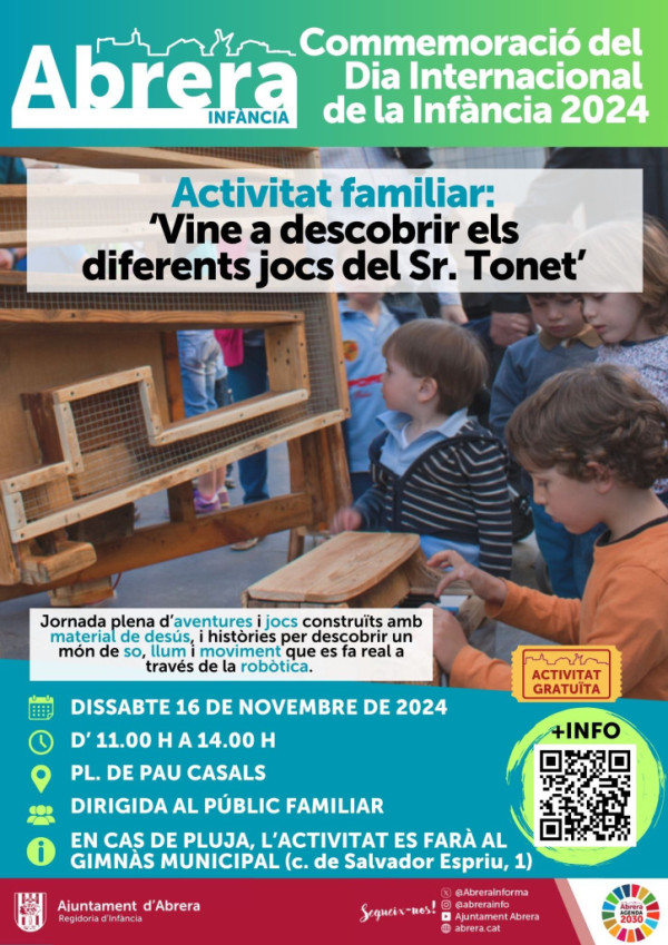 Des de la Regidoria d'Infància de l'Ajuntament d'Abrera organitzem, el proper dissabte 16 de novembre a partir de les 11.00 i fins a les 14.00 hores a la plaça de Pau Casals, una divertida oferta de jocs creatius i artesanals, sota el títol 'Vine a descobrir els diferents jocs del sr. Tonet', dissenyats per a tots els infants del municipi a càrrec de la companyia d’art Tombs Creatius. A més, a les 12.00 h, dos infants d’Abrera faran la lectura del manifest del dia, destacant la importància dels drets que han de gaudir tots els nens i nenes. En cas de pluja l’activitat es realitzarà al Gimnàs Municipal (c. de Salvador Espriu, 1)