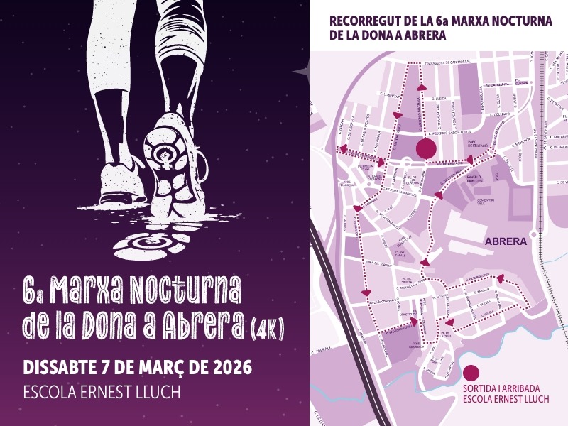 Per commemorar el Dia Internacional de les Dones (8 de març), des del Club d'Atletisme Abrera i des del servei d’Esports i Benestar i el servei d’Igualtat de l'Ajuntament d'Abrera un cop més fem una crida a les dones d’Abrera a ocupar els carrers de nit i caminar plegades pels drets de les dones. Per això, comptarem amb el suport de diverses entitats i comerços del nostre municipi, que formen part de la Xarxa Violeta d’Abrera i que es sumen a aquesta convocatòria per donar força de forma unitària al missatge i a la missió de la jornada del 8M.