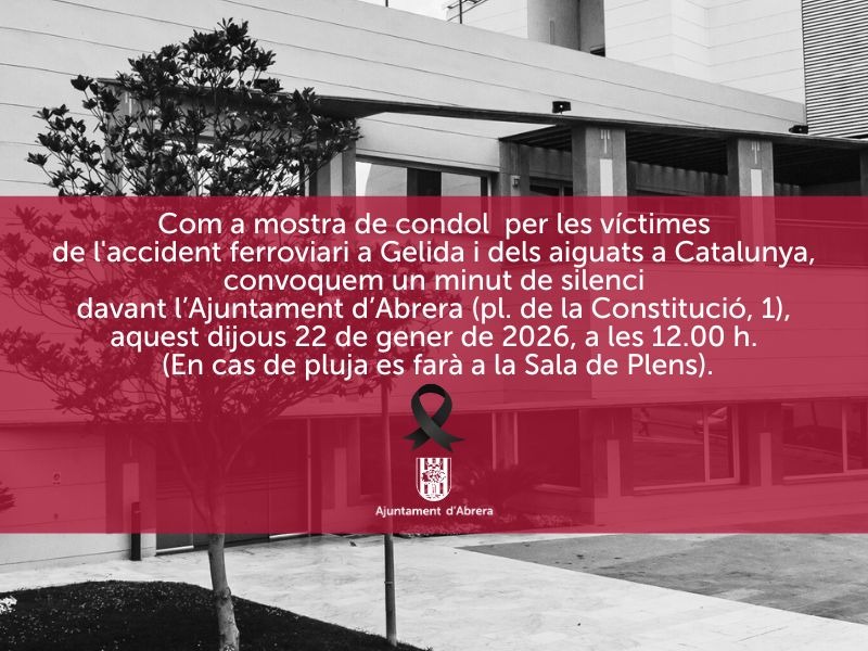 Des de l’Ajuntament d’Abrera expressem el nostre més sincer condol i traslladem tot el nostre suport a les famílies i amistats de les víctimes de l’accident ferroviari a Gelida i dels greus aiguats que han afectat Catalunya. En senyal de dol, hem convocat un minut de silenci el dijous 22 de gener de 2026, a les 12 h, davant de l’Ajuntament (pl. de la Constitució, 1).