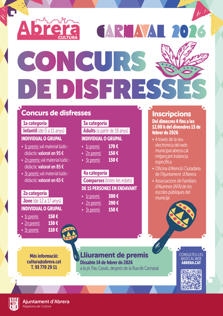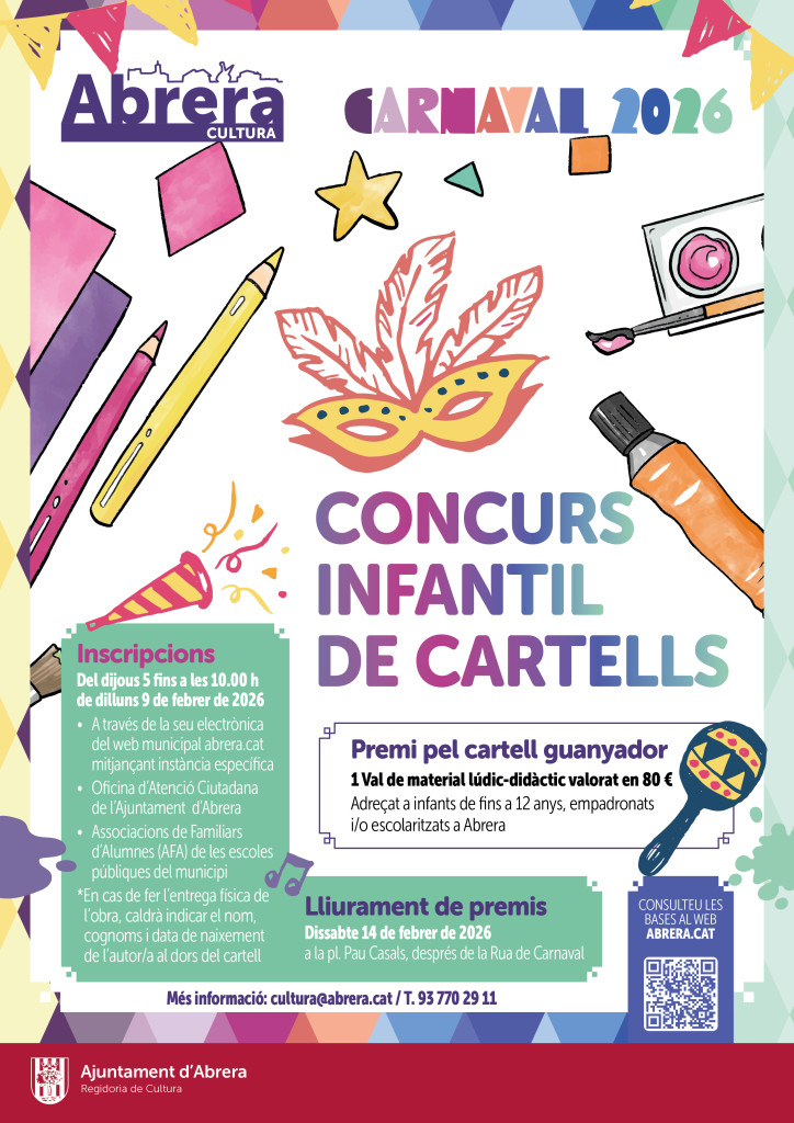 A Abrera torna el Carnaval! Des de l'Ajuntament d'Abrera felicitem l'abrerenca Lucía Pineda Crespo, de 12 anys, guanyadora del Concurs de Cartells de Carnaval 2026. Enhorabona! Des del consistori organitzem les activitats de Carnaval amb la col·laboració de la Comissió de Carnestoltes. Recordem que fins a les 12.00 h del divendres 13 de febrer de 2026, us podreu apuntar al Concurs de Disfresses.