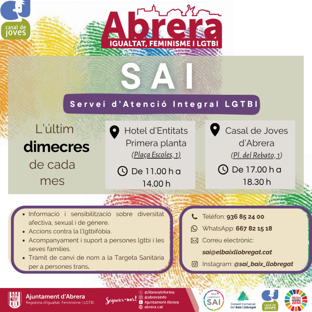 "Des de la Regidoria d’Igualtat, Feminisme i LGTBI impulsem el servei SAI per tal de donar resposta al col.lectiu LGTBI de forma presencial i a Abrera. Es tracta d’un servei especialitzat on hi trobareu informació, acompanyament en tràmits i acompanyament professional davant possibles situacions de discriminació o violència envers el col.lectiu. Des de l’Ajuntament d’Abrera seguirem impulsant tots els serveis públics necessaris en clau d’igualtat i a l’abast de tothom amb la finalitat de seguir dibuixant l’Abrera Igualitària en que tothom creiem i que tothom defensem”.