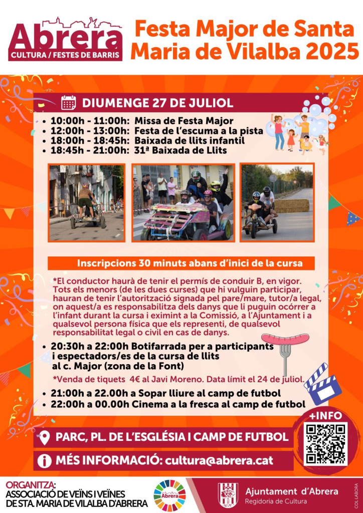 - 18:45h - 21:00h: 31ª Baixada de Llits (Inscripcions 30 minuts abans d’inici de la cursa. El conductor haurà de tenir el permís de conduir B, en vigor. Tots els menors (de les dues curses) que hi vulguin participar, hauran de tenir l’autorització signada pel pare/mare, tutor/a legal, on aquest/a es responsabilitza dels danys que li puguin ocórrer a l’infant durant la cursa i eximint a la Comissió, a l’Ajuntament i a qualsevol persona física que els representi, de qualsevol responsabilitat legal o civil en cas de danys.