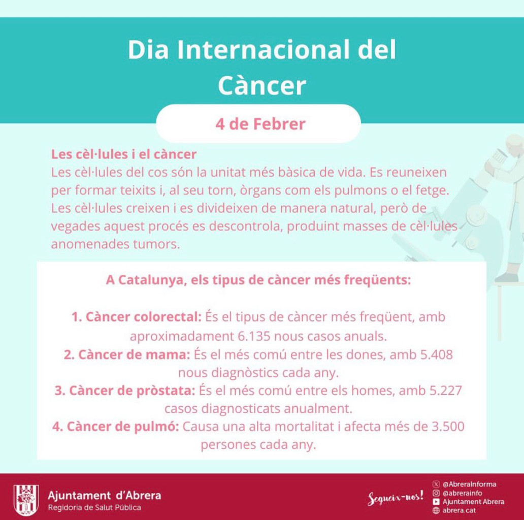 Com cada any, el 4 de febrer se celebra el Dia Mundial contra el Càncer, una jornada internacional amb l’objectiu d’augmentar la conscienciació i mobilitzar la societat per avançar en la prevenció i el control d’aquesta malaltia. Des de l’Ajuntament d’Abrera ens fem ressò d’aquesta commemoració i volem agrair la tasca solidària que duen a terme les persones voluntàries de la Junta Local d’Abrera de l’AECC, que al llarg de tot l’any contribueixen activament a la recaptació de fons destinats a la investigació oncològica.
