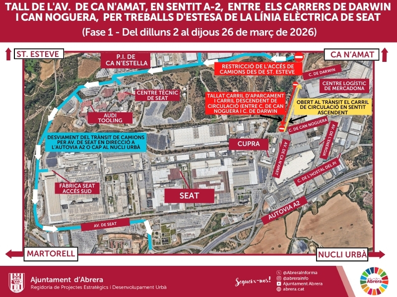 Des de l’Ajuntament d’Abrera informem que, amb motiu dels treballs d’estesa de la nova línia elèctrica de SEAT, es produiran canvis temporals en el trànsit a l’Avinguda de Ca n’Amat del Polígon Industrial del Barcelonès d’Abrera. Les actuacions, que s’executaran en dues fases successives, comportaran talls puntuals, canvis de sentit i desviaments que es trobaran degudament senyalitzats amb l’objectiu de garantir la seguretat i el bon desenvolupament de les obres.