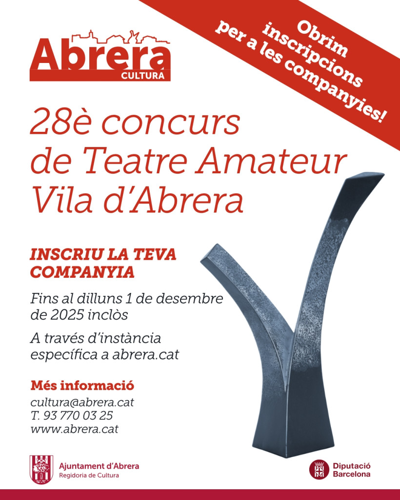 • Torna el Concurs de Teatre Amateur Vila d’Abrera, en la seva 28a edició! Les companyies interessades a participar podran formalitzar la seva inscripció fins el dilluns 1 de desembre de 2025 inclòs