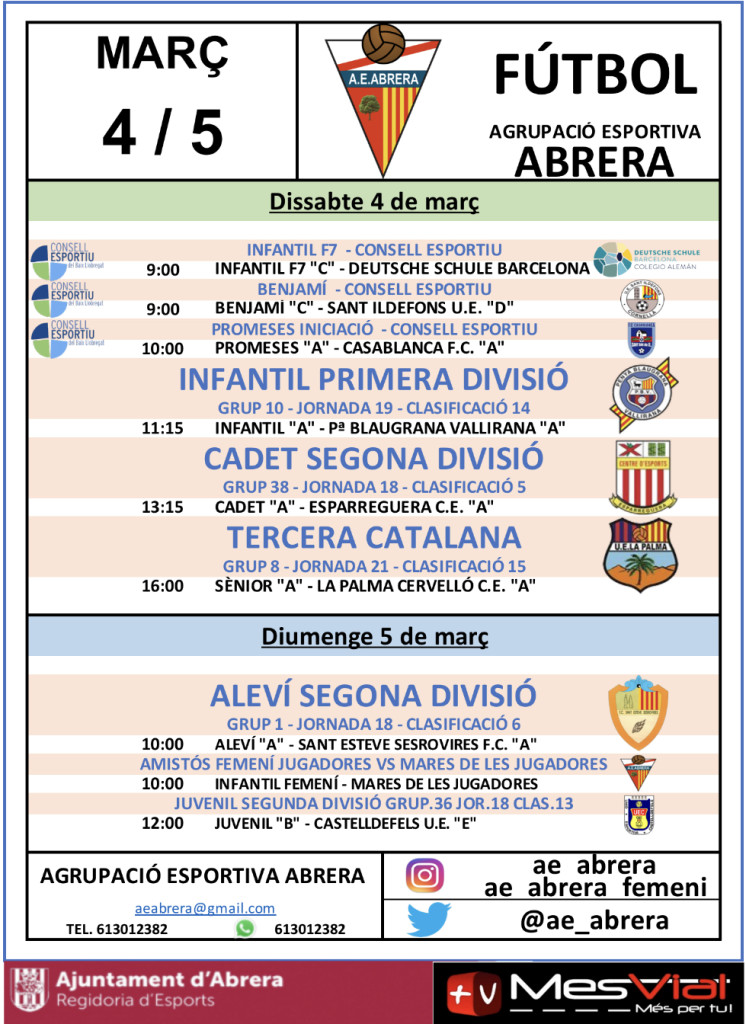 A continuació podeu consultar els esdeveniments esportius i el calendari dels partits que han estat facilitats per les entitats esportives. Aquest cap de setmana del dissabte 4 i el diumenge 5 de març de 2023, disputaran els seus partits i competicions l'Agrupació Esportiva Abrera, el Club Esportiu Futsal Abrera, el Club Bàsquet Abrera i el Club Frontenis Abrera. Donem suport als nostres equips!