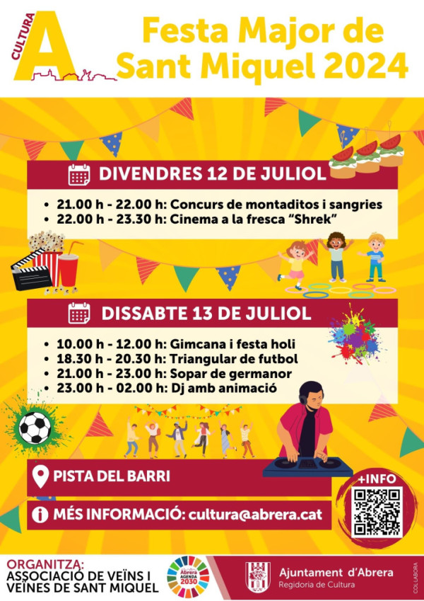 Des de l'Associació de Veïnes i Veïns del barri de Sant Miquel, amb la col·laboració de l'Ajuntament d'Abrera, s'ha preparat un programa que inclourà actuacions musicals i activitats per a la canalla, així com el tradicional sopar de germanor. Tots els actes tindran lloc a les pistes del barri de Sant Miquel, durant el divendres 12 i el dissabte 13 de juliol d'enguany. Repasseu el programa d'activitats de la Festa Major del barri de Sant Miquel: